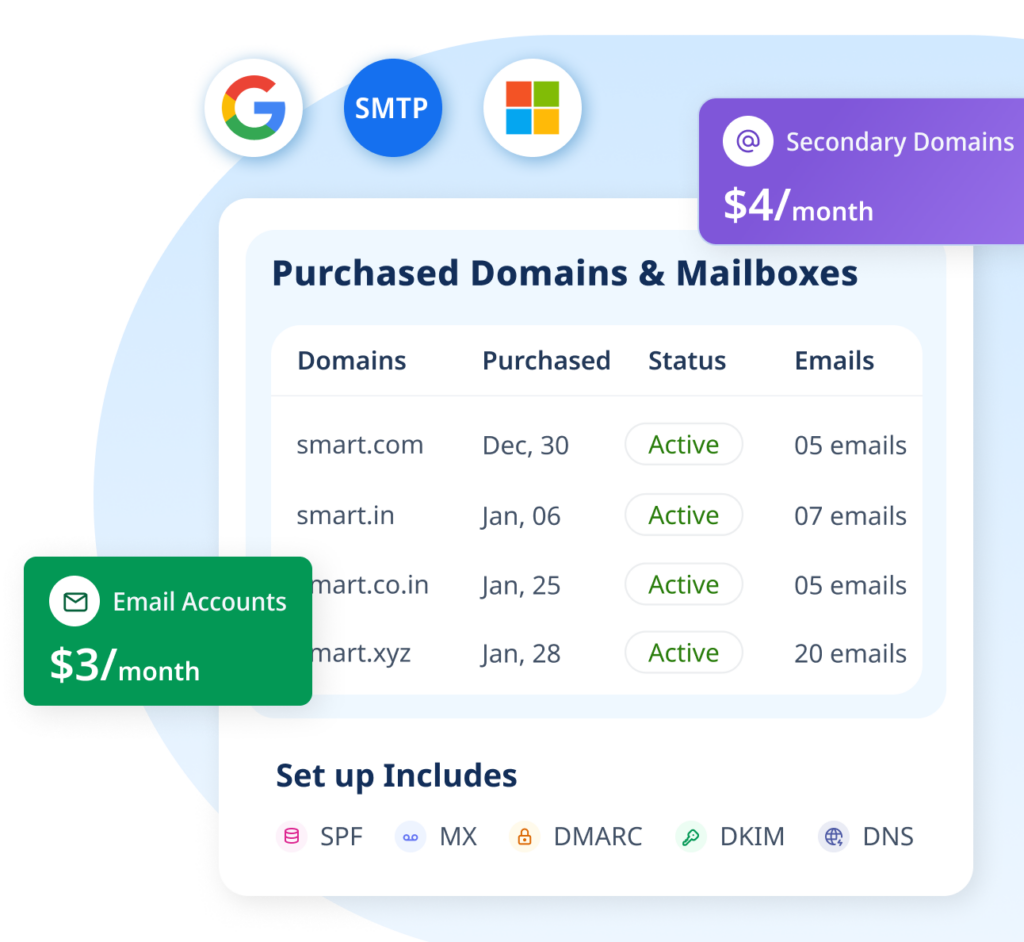 Buy fully authenticated secondary domains with Google, Microsoft 365, SMTP mailboxes in minutes. No IT setup needed. Learn More